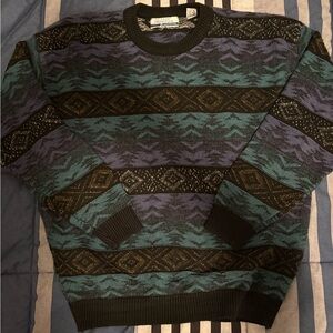 Elevate your style with this patterned crewneck sweater. Featuring a unique design in black, blue, and green, it's a versatile addition to any wardrobe. Made in Canada.