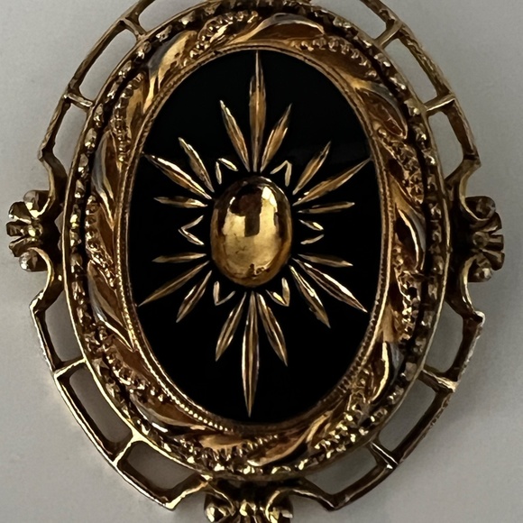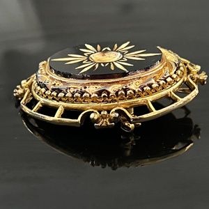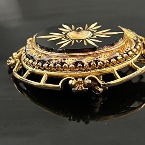 Vintage Pauline Rader Brooch Victorian Revival Molded Black Glass Gold P…