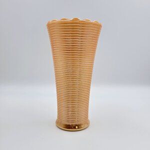 Vintage Peach Luster Fire King Milk Glass Vase With Ribbed Design Scalloped Edges Read.