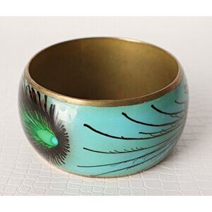 For your consideration is a vintage wide bracelet with enamel painted peacock feather and brass on the inside, circa 1980s.