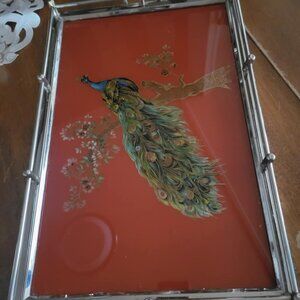 Vintage reverse painted glass Peacock tray with Chrome finishes. Beautiful to display, use on a dressing table to host your perfumes. Just a very lovely piece of history. The painting is beautifully detailed with a red background. Colors are vibrant! I wouldn't use this for serving, I have basically just wiped this to clean. These are rare to find in this excellent condition! I love this piece and used it as a backdrop to various collectible peacock pieces.