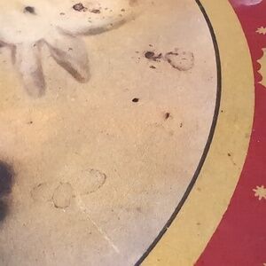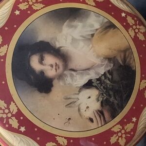 Round tin with a vintage portrait of boy and rabbit, Features red and gold floral design by Peak Frean.