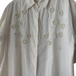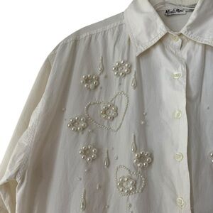Vintage Pearl Embellished Shirt Size L White Cotton Button Up Down 80s 90s