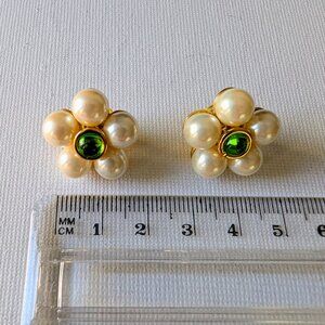 Classic vintage pearl cluster earrings in a timeless floral design with a striking green center stone. Gold-tone setting adds elegant, old-school charm. Easy to style and always in fashion.