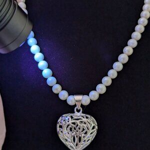 This vintage necklace is beaded and has a silver tone metal filigree-style fishhook clasp stamped "S 14K". Though it is not magnetic, I believe the clasp is gold plated or gold filled, not solid (there are yellow undertones in the filigree details). The coil beads beside the clasp ARE magnetic. The necklace is strung with what appear to be cultivated freshwater pearls. The beads are cold, very gritty, and have beautiful natural tone variation, though they are quite similar in size and shape. The pendant is made of a silver tone metal and shaped like a puffy heart, hollow and full of cut-outs. There do not appear to be any stamps, though the pendant is not magnetic either.