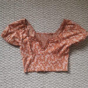 Gorgeous muted orange puff sleeve blouse with framed neckline.