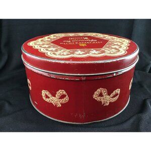 Hard-to-find tin, from Peek, Frean & Co., Ltd, Biscuit Manufacturers. By Appointment to the Late King George VI, which dates it to the period around 1952. Deep red, decorated with a creamy lace design.