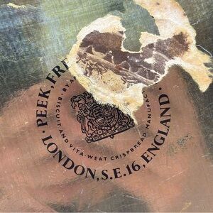 Vintage Peek Freans London, England biscuit tin with medieval hunting and agricultural scenes. The scenes depicted are wonderfully detailed and fun to look at. There is paint rubbed off in places, but it is still mostly intact. The tin itself is in excellent shape for a vintage piece. The lid features grape clusters and has some small dents, but it does still fit tightly. Free of rust.