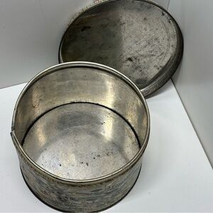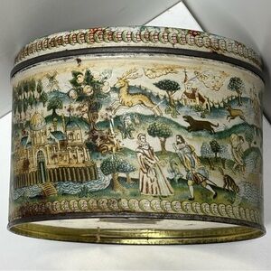 Vintage Peek Freans London, England biscuit tin with medieval hunting and agricultural scenes. The scenes depicted are wonderfully detailed and fun to look at. There is paint rubbed off in places, but it is still mostly intact. The tin itself is in excellent shape for a vintage piece. The lid features grape clusters and has some small dents, but it does still fit tightly. Free of rust.