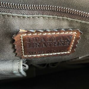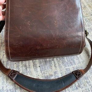 This brown leather messenger bag is from Pelle Studio/Wilsons Leather. It is made from Italian leather and is incredibly sturdy (think structured, not floppy leather). The shoulder strap is adjustable and is padded where it would sit on your shoulder. There are several pockets, including one with a zipper closure. Some stitching has come undone on the corner of the front pocket (see photo). The bag body measures approximately 11 inches tall x 13 inches wide.