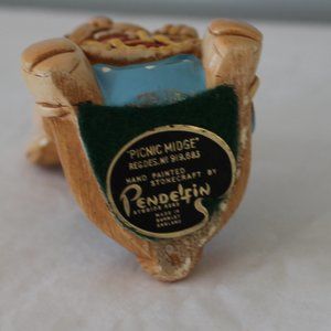 Stoneware bunny figurine purchased in mid 70's. Blue and white polka dot outfit. "Made in England" is engraved by tail.