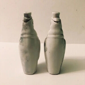Both penguins are pre-owned and in very used condition. Both corks have degraded on the tops, but one has a repair with tape so that the hat sits on the penguin. Turning the caps around allows drinking/pouring from rear of head. They have a lot of paint wear, marks and stains on them. Please see all photos for exact items.
