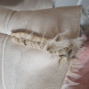 Overall good used condition, but there are a few small marks. It is machine washable. Pit to pit is 24" Polyester and acrylic. Soft exterior, cozy interior.