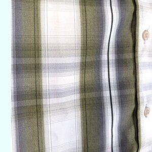 This vintage shirt by Penmans is made of 100% polyester and has short sleeves and a button up front. The shirt features a green and white plaid (which photographs a little dark). The most accurate representation of the colours in this shirt are in picture #3. There is a single front pocket on the left chest, and the bottom hem is slightly rounded. There is normal wear, but no issues affecting wearability.