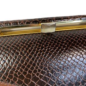 Beautiful clutch. Very good condition with minor marks and signs of wear. I’ve added a generic gold chain for added flair (included). Faux leather with snake skin embossing. Rich brown tones. See photos for condition and measurements.