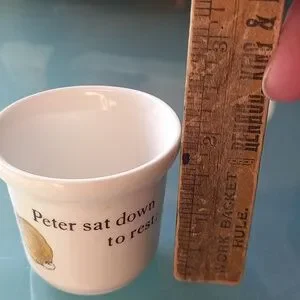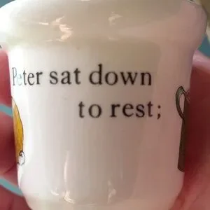 This is a vintage Wedgwood ceramic egg cup featuring Peter Rabbit from the Beatrix Potter stories.
