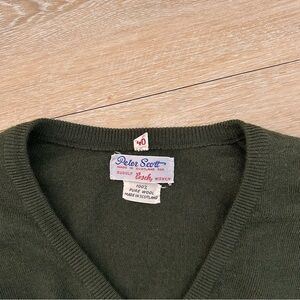 Elevate your wardrobe with this classic vintage Peter Scott V-neck sweater in a rich forest green. Crafted from 100% pure wool and made in Scotland, this timeless piece is a true vintage find. The sweater features a clean V-neckline, ribbed cuffs and hem, and a versatile deep green shade that pairs effortlessly with jeans, chinos, or dress pants.