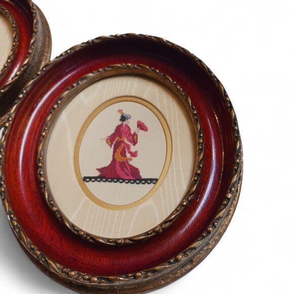 Lovely pair of vintage petit point portraits featuring a man and woman in Asian-style clothing. Intricately hand-stitched and set under glass in ornate gold gesso oval frames with burgundy highlight. Circa 1880–1920, in the style of Victorian and early Edwardian décor. Beautiful craftsmanship and in very good condition considering their age. Approx. 8" x 7" x 1"