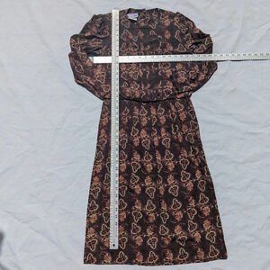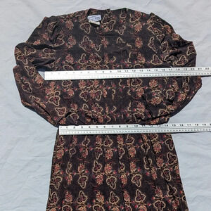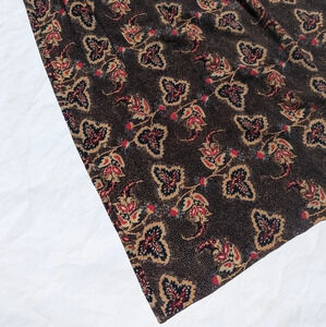 This vintage dress is perfect for night events, fall dates and to cover up on chilly summer nights. The black background with the added depths of copper, Burgundy and sage greens.