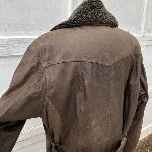Vintage Petroff brown cowhide leather coat has quilted lining for added warmth. Faux-fur collar is removable for two different looks in one jacket. Buttery soft leather has that perfect lived-in feel. Includes removable belt. Two inner pocket at left chest, outer hip pockets have flaps + side pockets, plus hand warmer pockets at the chest. Men's size medium, see below for garment measurements.
