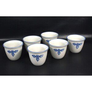 These vintage stoneware serving pieces are a set of 6 custard cups /ramekins made by Pfaltzgraff in the "Yorktowne" pattern. They have a soft white main body with a blue floral design.