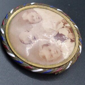 Vintage Photo Brooch Enamel Braid Gold Tone