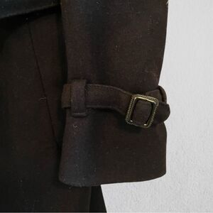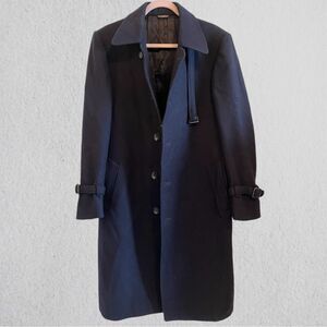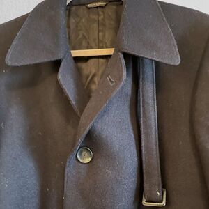 Absolutely stunning vintage Balmain wool coat. Military style, structured wool coat in a very dark navy blue. Coat buttons up, has a belt, is lined, a slit in the back, hits a bit below the knee. This is a men’s coat, but very much unisex and so well made it will hold up for many many years! It’s in excellent condition. There is no size, I believe a men’s Medium / women’s large best but please see measurements in photos.