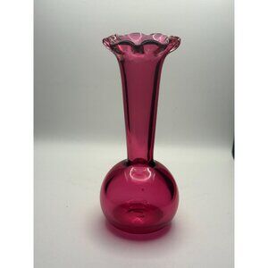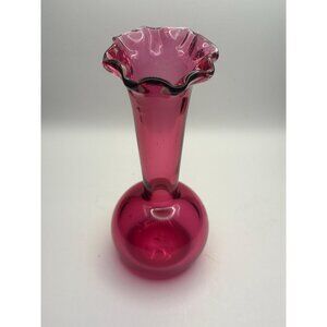 Vintage Pilgrim (?) Handblown Cranberry Glass Bud Vase – 7” Tall with Ruffled Rim – Glows Under UV (Manganese Reactive)