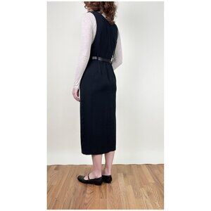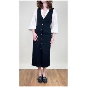 Step into timeless style with this charming vintage black pinafore dress, perfect for layering over your favorite blouses or turtlenecks. Its classic button-front design and flattering midi length make it a versatile addition to any wardrobe, that can be styled in an endless amount of ways