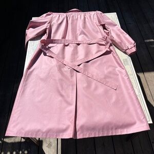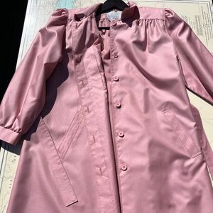 Vintage rose pink belted Eaton’s jacket with scarf. Lovely vintage piece! Sort of a trench style, with feminine ruching at shoulders and across chest, slight shoulder pads. 100% polyester, tagged as a size 10 petite. Measures 18" across shoulders, 23" pit to pit, 21" shoulder to cuff, 44" long.