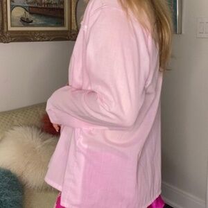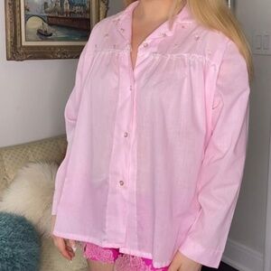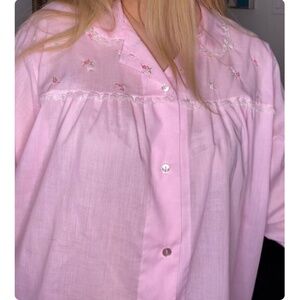 Vintage Pink Button Down Poly Cotton Sleep Shirt - Embroidered Roses - Lace - M