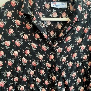 Cute small pink floral button up shirt. Pretty long, would look cute tied up or tucked in! Made in U.S.A