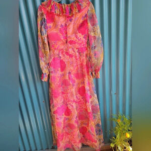 Vintage Pink Floral Chiffon Dress Long Sleeves Long Small 70s Mrs, Roper