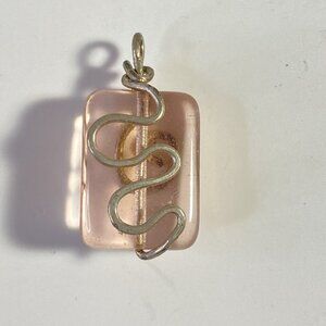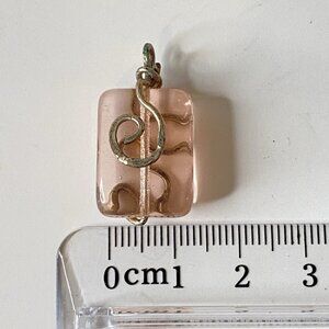 This charming vintage pendant features a rectangular pale pink glass block with gold-toned swirl wire detail encased inside and wrapped with an artistic loop on the outside. Measuring about 2.5 cm long, it has a delicate, handmade appeal that makes it a wonderful everyday accent or a thoughtful gift. The glass has a soft blush tone with internal shimmer, and the wire swirl adds both movement and character. Light patina on the metal enhances its vintage charm.