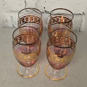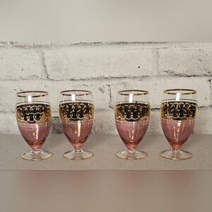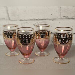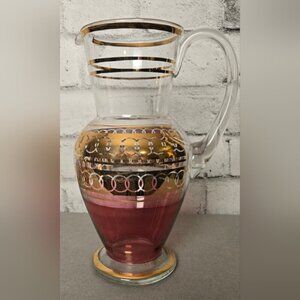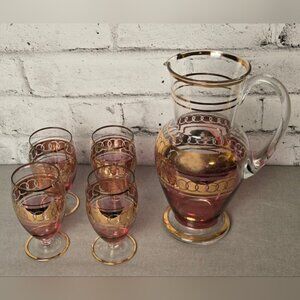 Serve in style with this vintage 5-piece glass pitcher and goblet set, featuring a stunning rose pink ombré fade and intricate gold and black band detailing. The elegant design gives off major Hollywood Regency / Mid-Century Modern vibes — perfect for entertaining or display in your retro bar cart setup.