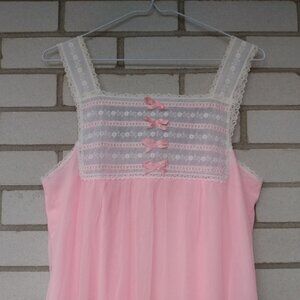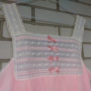 Vintage Pink Nylon Chiffon Layered Nightgown- Long Nightie with Lace and Ribbon Bows