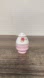 Vintage ceramic salt shaker with a floral design. The shaker has a curved shape, with the bottom half in pink and the top half in white. A gold line separates the two sections. The white portion features a floral motif with a pink rose, blue and yellow flowers, and green leaves. Multiple holes at the top and the original cork stopper at the base. A decorative piece for a collection of vintage shakers or as a unique touch to your dining table.