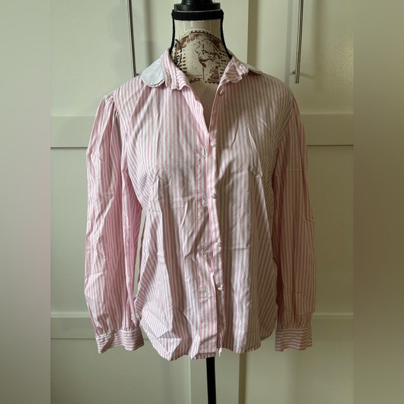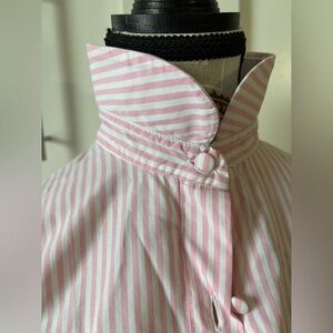 Stylish pink and white striped button-up shirt.