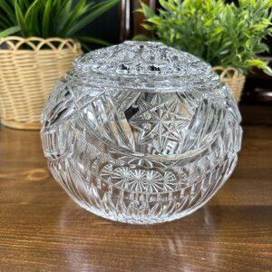 A stunning one of a kind vintage cut crystal flower frog vase featuring a bold pinwheel and starburst pattern. This globe-shaped bowl is made of thick, heavy leaded glass with brilliant sparkle and deep cuts. Comes with its original removable lid with multiple holes—perfect for floral arranging. Likely produced mid-20th century (1950s–1970s).