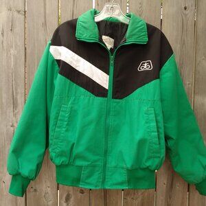 It zips up the front and is insulated. Suitable for Spring, Fall and Light Winter.