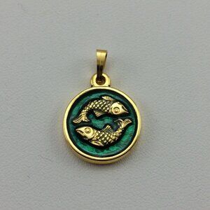 Vintage Pisces Zodiac Sign Pendant Charm Goldtone Metal Green Signed
