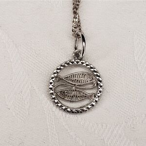 Vintage 1980s Scandinavian Sterling Silver Pisces double fish circular Pendant with intricate cutout fish scales and Diamond Crosshatch Pattern edge, Stamped STER & Makers Mark, Excellent Vintage Condition.