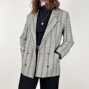 Stunning Vintage Plaid Double Breasted Oversized Blazer Jacket Pea Coat Preppy Long Light Suit