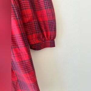 A beautiful dress in red and navy plaid with a sweet collar trimmed in lace and two button details. This knee length dress has long puff sleeves, button back closure and back ties.