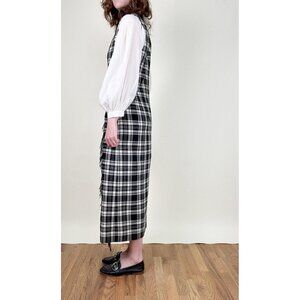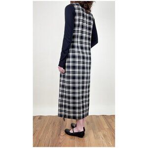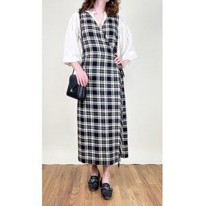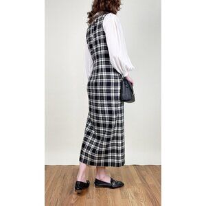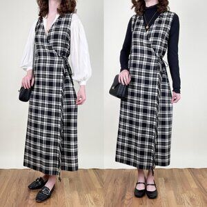 Step back in time with this charming vintage plaid maxi dress, featuring a flattering wrap-style silhouette and a classic black-and-white knit pattern that's eternally chic. Perfect for layering over a crisp white blouse or a cozy turtleneck!