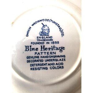 Marked on back “Enoch Wedgwood (Tunstall) Ltd. – England – Blue Heritage Pattern – Genuine Hand Engraving – Decorated Underglaze – Detergent & Acid Resisting Colors.”