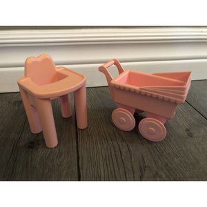 Playskool Dollhouse 1990 Pink Baby High Chair and Stroller Pram PlasticExcellent used condition2 pieces, both pink plastic. The wheels move on the pram/stroller