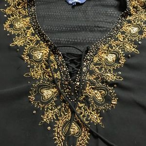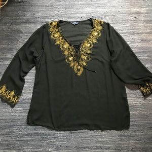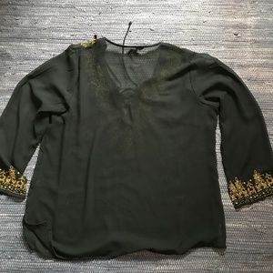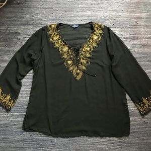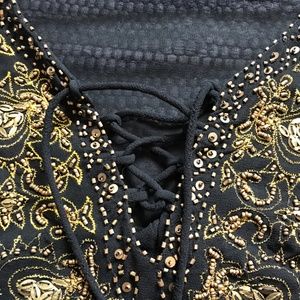 Romantic boho-style beaded top from Penningtons in black with gold embellishments. Sheer fabric with beading and embroidery around the wrists and neckline. Lacing closure. In very good used condition. A few loose threads, and a bit of signs of previous wear under arms. 100% polyester.