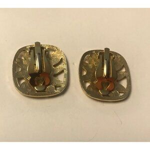 Vintage floral enamel clip-on earrings. Gold tone with green and red accents. Elegant and timeless accessory for any attire.