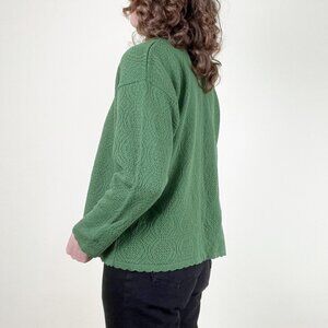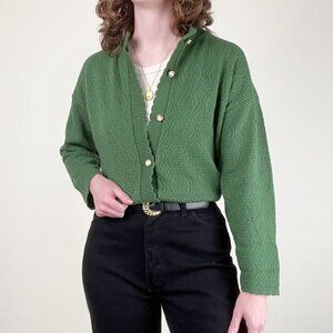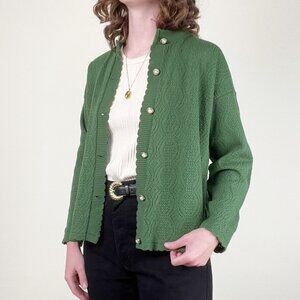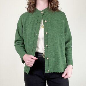 Embrace a piece of Canadian-made fashion history with this beautiful pointelle knit vintage cardigan sweater, featuring a gorgeous green hue and delicate scallop-edged trim. The classic silhouette is elevated by elegant pearlescent buttons, making it a perfect and unique layering piece for a touch of timeless charm.